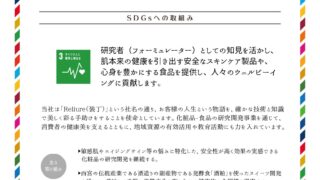 当社は国連が提唱する「持続可能な開発目標(SDGs)」に賛同し、事業活動を通じて地域課題の解決および、持続可能な社会の実現に努めてまいります。研究者(フォーミュレーター)としての知見を活かし、肌本来の健康を引き出す安全なスキンケア製品や心身...
